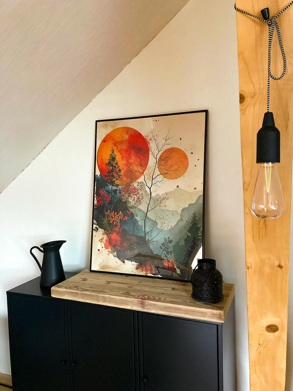 A framed art print featuring two warm orange suns, abstract mountains and autumn foliage hangs above a wooden desk in a minimalist home office. A soft beige chair, a white table lamp with gold accents and a plant complete the calm, modern interior.