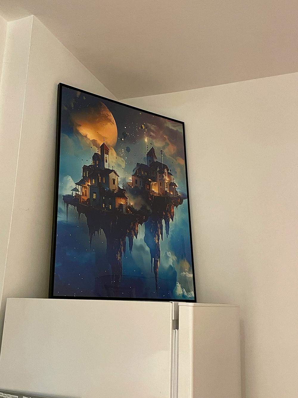 A woman kneels on the floor while unboxing a large framed art print showing a surreal scene of glowing floating houses suspended in a dreamy night sky beneath a warm moon. Vivid blue tones, atmospheric clouds, and crisp details highlight the premium black metal frame and museum-grade matte paper. Bubble wrap and packaging materials surround the artwork, emphasizing careful protection and high-quality presentation.